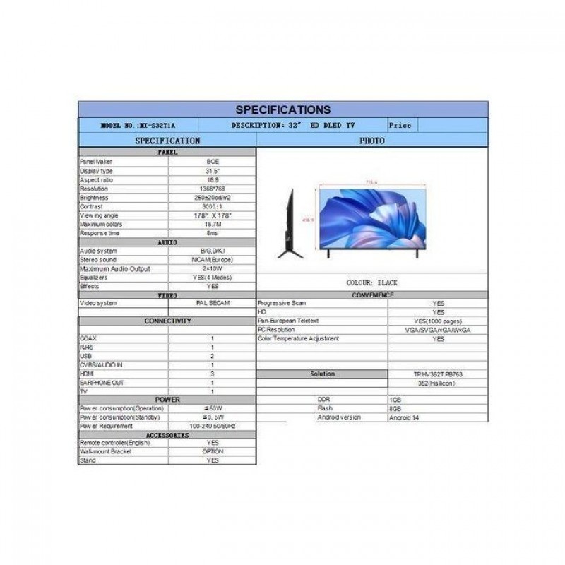 This is a 32-inch HD Smart DLED TV featuring a BOE panel with 1366×768 resolution, 250 cd/m² brightness, and a 178° wide viewing angle. Powered by a Hisilicon TP.HV352T.PB753 solution and running Android 14, this model combines performance with smart capabilities. It includes 3×HDMI, 2×USB, RJ45, and supports Pan-European Teletext and multiple PC resolutions. With a 2×10W audio output, NICAM stereo, 4-mode equalizer, and progressive scan video, this TV delivers a full-featured and energy-efficient experience, a perfect blend of performance, elegance, and smart features designed to enhance your entertainment experience. Immerse yourself in a world of vivid colors, clear imagery, and seamless connectivity