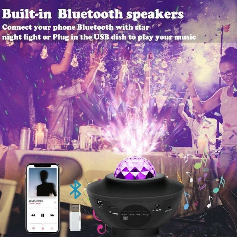• Built-in Bluetooth Speaker: Connect your phone via Bluetooth with this LED projector lights or plug USB in port to play music at light show. Create a relaxing environment with light projector.