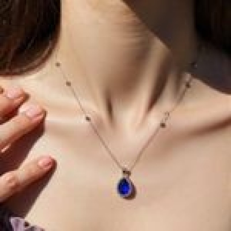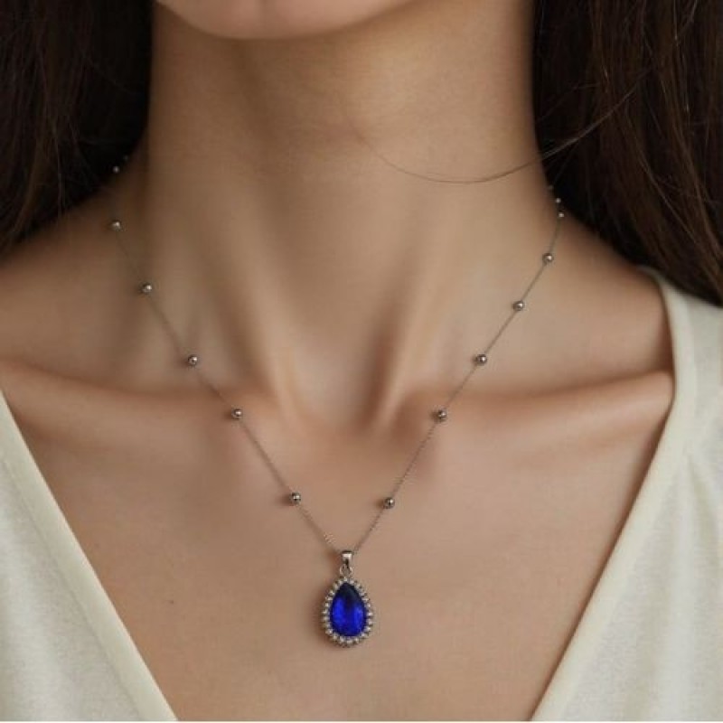 This necklace is elegant and captivating, with a delicate chain crafted from high-quality alloy, adorned with evenly spaced small beads, adding a sense of refinement to its simplicity. The centerpiece of the necklace is a teardrop-shaped blue gemstone pendant, with a deep and rich hue that seems to hold endless mystery. Surrounding the gemstone is a halo of small, sparkling simulated diamonds that, under the light, complement the blue stone, adding a brilliant luster to the overall design. When worn, it beautifully accentuates the neckline, adding a touch of grace and nobility to the wearer.