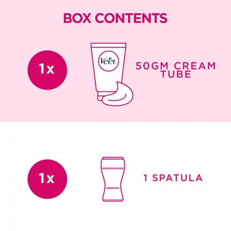 Veet hair removal cream for sensitive skin has been specially formulated to give you sumptuously smooth skin in just 5 minutes. Enriched with aloe vera and vitamin E, it helps avoid embarrassing rashes, lumps and bumps, leaving even sensitive skin touchably soft. Suitable for use on legs, arms, underarms and bikini line, it works even on very short hair for luxuriously smooth skin that lasts up to twice as long as shaving with your regular razor. It couldn’t be easier to use - simply cover the desired area with cream using the curved end of the Perfect Touch spatula, leave for 5-10 minutes then rinse off using the head of the spatula; this helps to pull the dissolved hair away, leaving skin perfectly smooth a