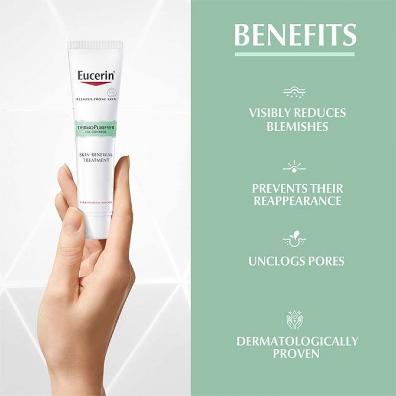 The innovative Eucerin DermoPurifyer Skin Renewal Treatment has been specially formulated to reduce the appearance of pimples, papules and pustules as well as to fade acne marks.