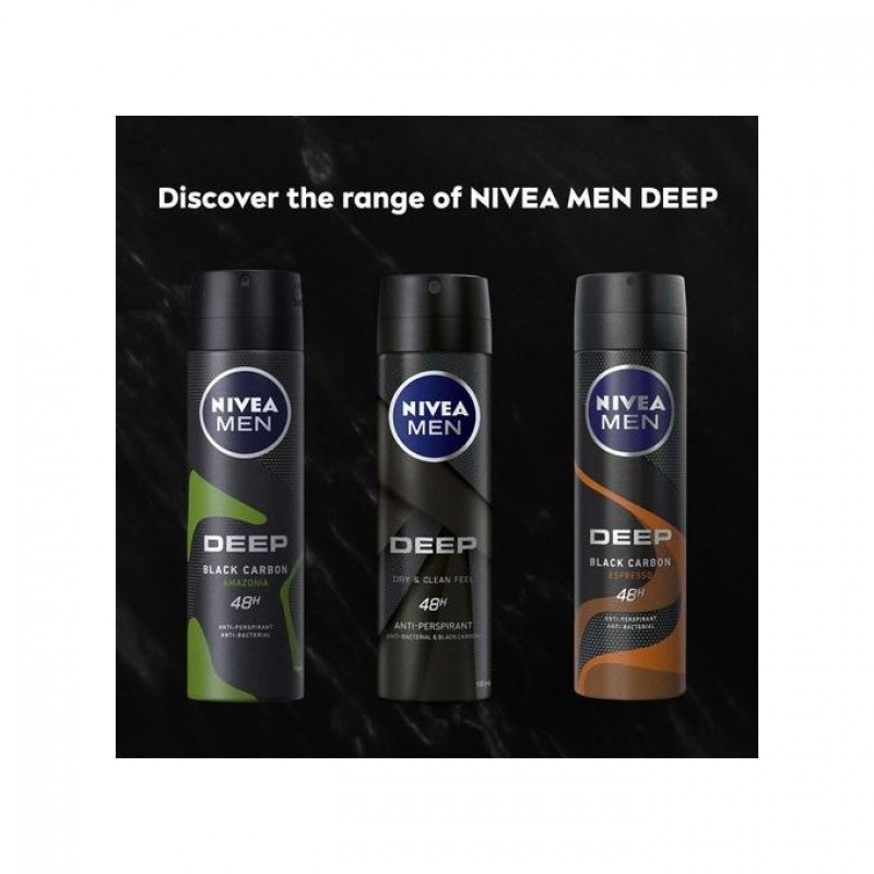 NIVEA MEN DEEP Anti-Perspirant Deodorant Spray with a Black Charcoal formula acts powerfully against bacteria and sweat while eliminating body odour with a modern and masculine Dark Wood Fragrance. The effective formula leaves you feeling as if you have just stepped out of the shower and gives you long-lasting dryness all day.