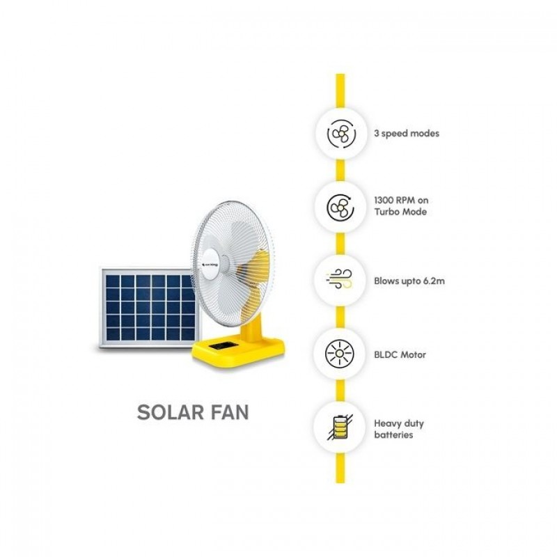 • With a 5100mAh battery, it has a runtime of up to 18 hours on a single day’s charge on the low speed mode.On average, day-to-day use, the Sun King Solar Fan requires charging once every two days.